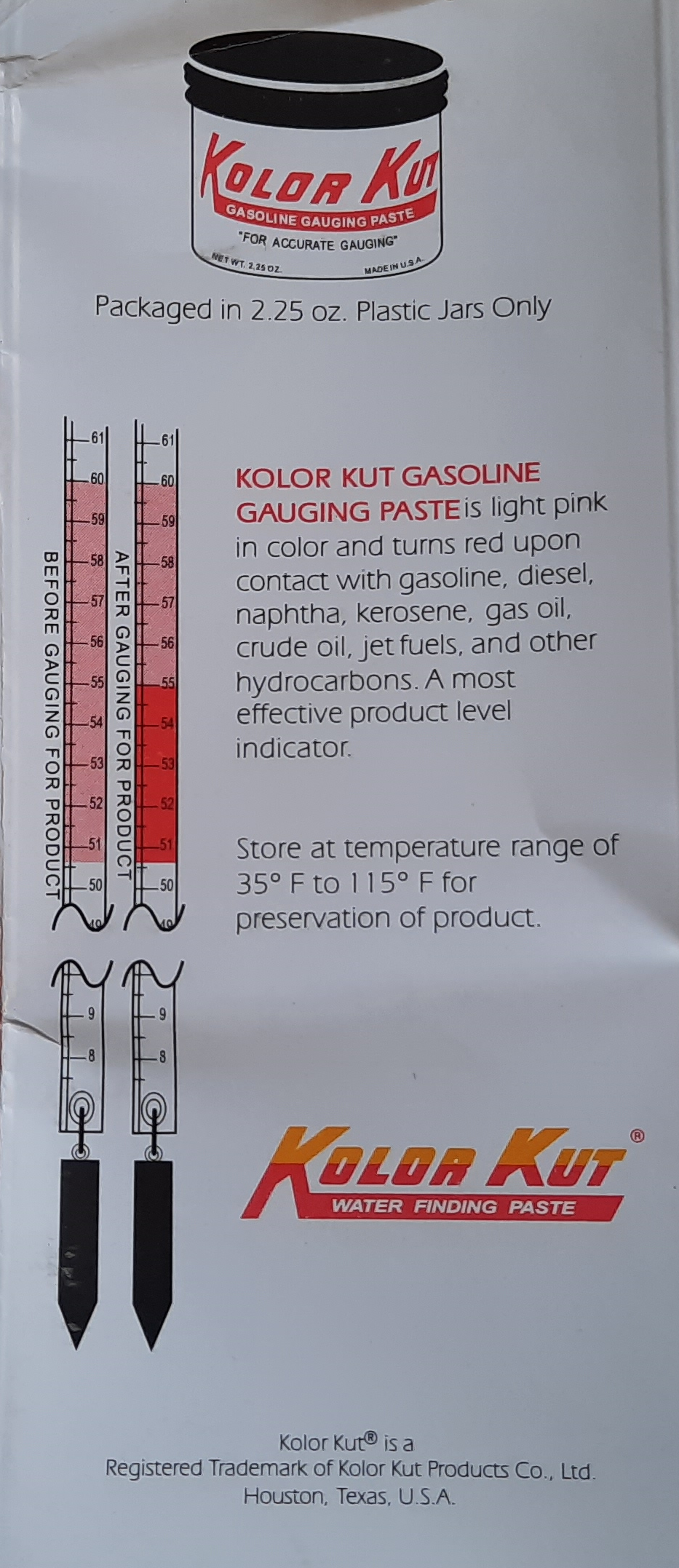 Kolor Kut Gasoline Gauging Paste is a light pink, semi-solid paste used to measure fuel levels in tanks. It adheres well to gauging sticks, providing a clear visual indication of liquid levels. Non-hazardous and easy to use, it ensures safe and accurate gauging of petroleum products.
