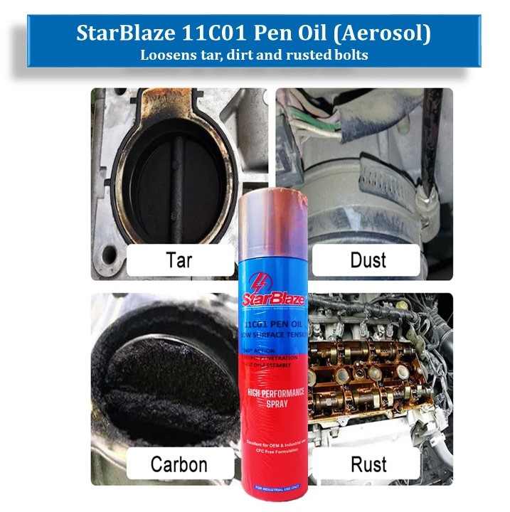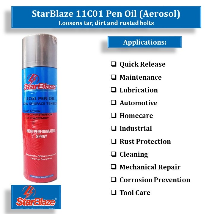 StarBlaze 11C01 Pen Oil is an effective aerosol product designed to penetrate and loosen rust, tar, dirt, and other stubborn residues. Its low surface tension allows the oil to migrate into tight spaces, making it ideal for use on rusted bolts and mechanical components.